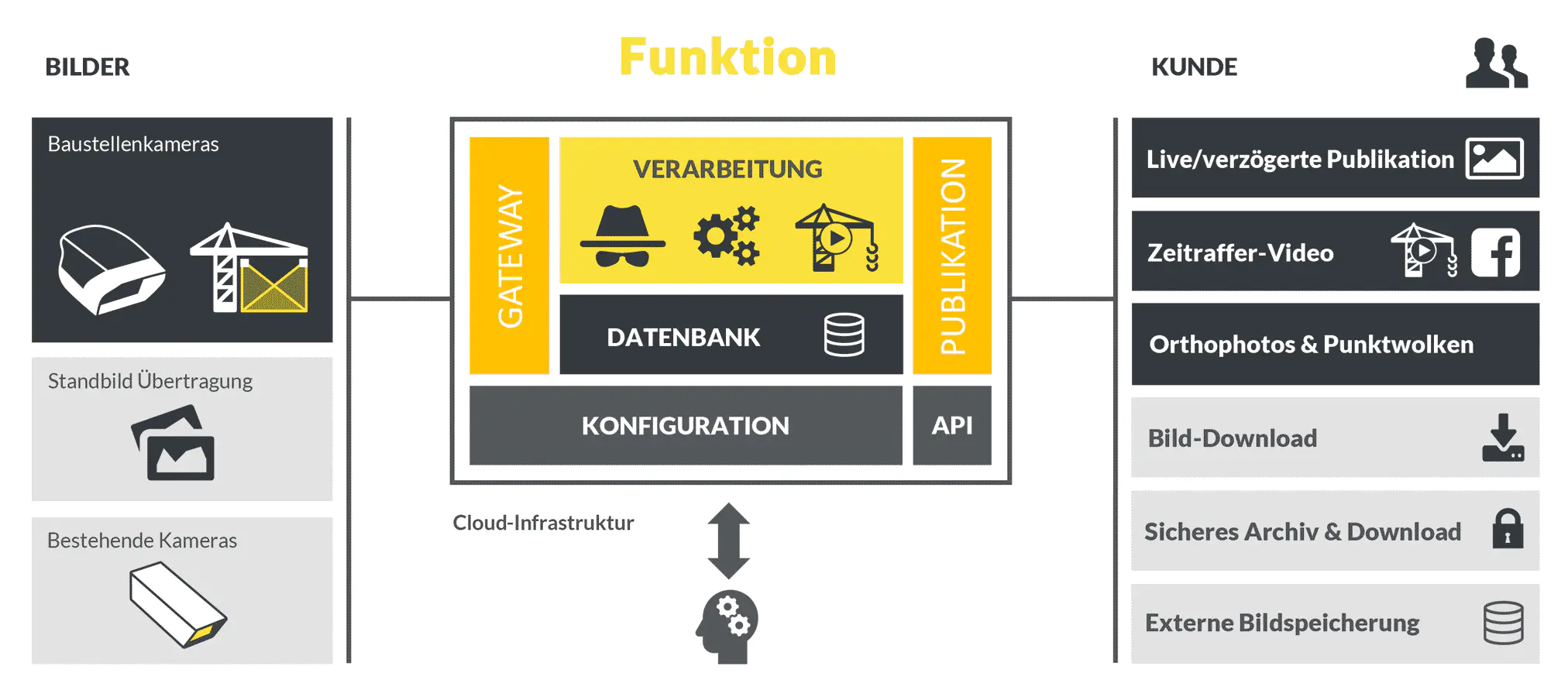 Die Cloud-Infrastruktur dient der Verarbeitung und Archivierung von Standbildern. Unabhängig davon, ob dein Projekt einige Monate oder mehrere Jahre dauert, die avisec-Cloud ist darauf ausgelegt. Ein Bildintervall von 5-10 Minuten ist für ein typisches Bauprojekt, das mehrere Jahre dauert, ausreichend. Ein in wenigen Tagen fertiggestelltes Gebäude wird sinnvollerweise mit mehreren Bildern pro Minute dokumentiert. Die avisec-Cloud ist für jede Anwendung mit Bildern im JPG-Format geeignet. Die Datenmenge ist durch das Portal nicht begrenzt.